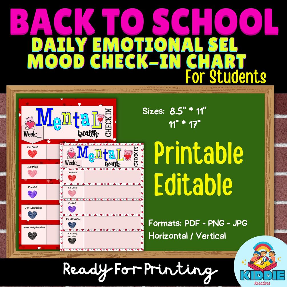 Welcome to our empowering Mental Health Bulletin Board's | daily emotional check-in chart for students! Our Daily Feelings and Emotions Chart is available in three printable formats: PDF, PNG, and JPG. Additionally, we provide a link to an editable Canva version, allowing you to add your personal touch and tailor the charts to your classroom's unique needs.